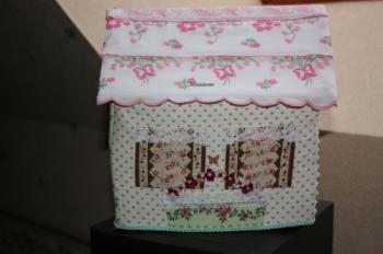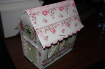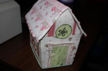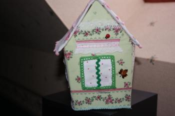 La porte d'entée est entouré de dentelle, un bouton est fixé pour figurer la poignée, la fenêtre ronde est ornée d'un morceau de bijou.